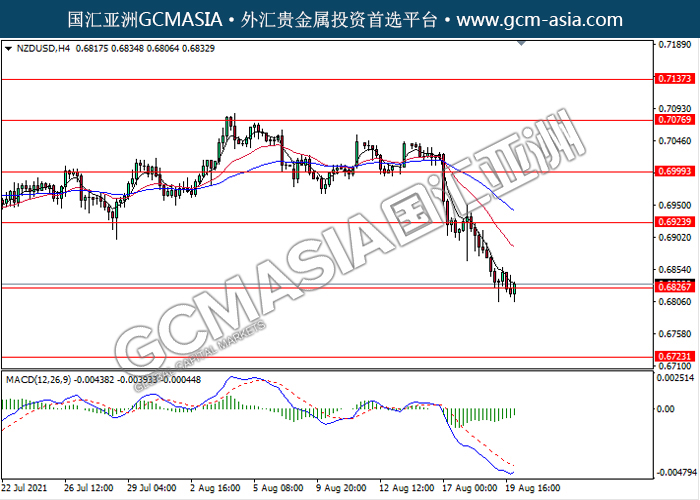 20210820 NZDUSD-午间 by keyk | Aug 20, 2021 | 纽元兑美元 | 0 comments NZDUSD,H4: 纽美空头排列,目前测试前期支撑。然而,MACD空头动能略减,短期关注多头反弹为主。上方关注0.6925压力和0.7000压力,下方关注0.6825支撑和0.6725支撑。