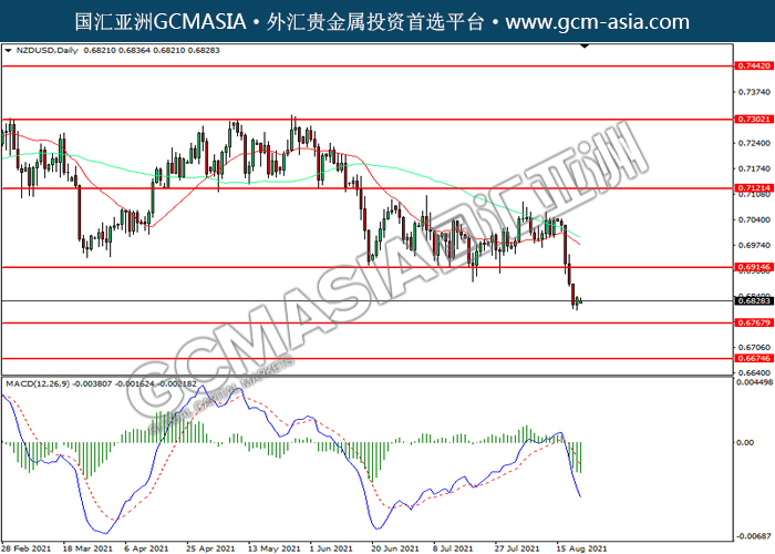 20210823 NZDUSD by willy | Aug 22, 2021 | 纽元兑美元 | 0 comments NZDUSD,Daily: 纽美下破前期支撑,持续下行。MACD空头动能略增,短期可关注空头为主。上方关注0.6915和0.7120压力,下方关注0.6965支撑和0.6675支撑。