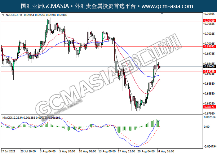 20210825 NZDUSD-午间 by keyk | Aug 25, 2021 | 纽元兑美元 | 0 comments NZDUSD,H4: 纽美近期高位承压回落,目前测试靠近前期支撑。MACD多头动能略减,若突破可继续看空方向为主。上方关注0.7000压力和0.7075压力,下方关注0.6925支撑和0.6815支撑。