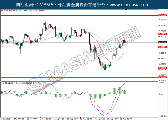 20210826 NZDUSD by willy | Aug 26, 2021 | 纽元兑美元 | 0 comments NZDUSD,H4: 纽美震荡上行。然而,MACD多头动能略减,短期可关注技术性回调为主。上方关注0.7015和0.7120压力,下方关注0.6940支撑和0.6815支撑。