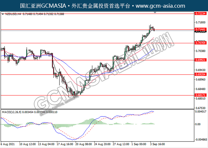 20210906 NZDUSD-午间 by keyk | Sep 6, 2021 | 纽元兑美元 | 0 comments NZDUSD,H4: 纽美高位承压回落。MACD多头动能略减,短期继续关注空头回调为为主。上方关注0.7145压力和0.7225压力,下方关注0.7075支撑和0.6990支撑。