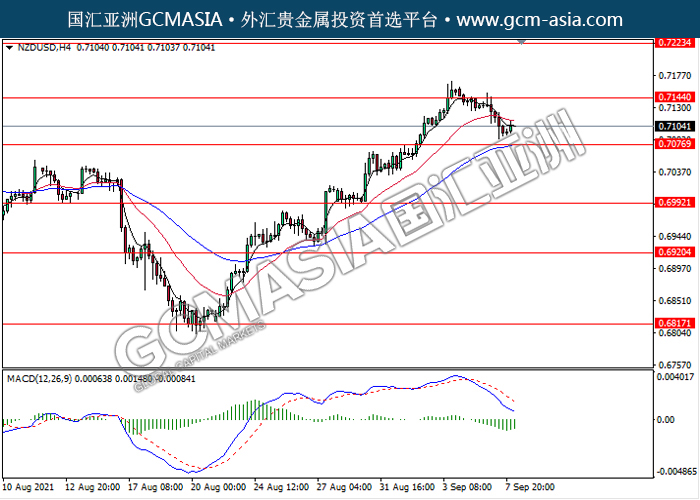 20210908 NZDUSD-午间 by keyk | Sep 8, 2021 | 纽元兑美元 | 0 comments NZDUSD,H4: 纽美近期高位承压回落,目前测试靠近前期支撑。MACD动能略减,若突破可继续看空为主。上方关注0.7145压力和0.7225压力,下方关注0.7075支撑和0.6990支撑。