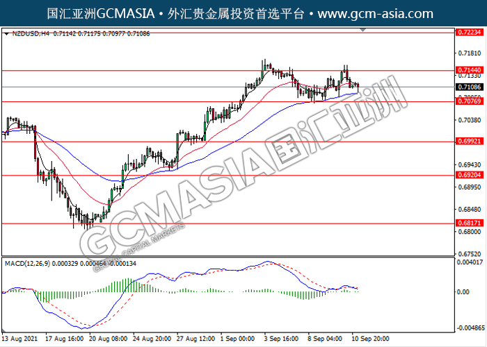 20210913 NZDUSD-午间 by keyk | Sep 13, 2021 | 纽元兑美元 | 0 comments NZDUSD,H4: 纽美高位承压回落。MACD形成死叉,动能略减,短期可继续看空回调为主。上方关注0.7145和0.7225压力,下方关注0.7075支撑和0.6990支撑。
