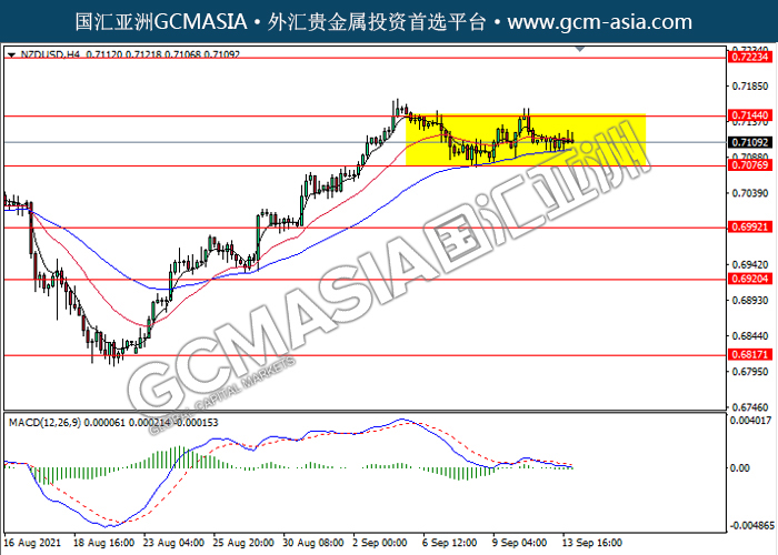 20210914 NZDUSD-午间 by keyk | Sep 14, 2021 | 纽元兑美元 | 0 comments NZDUSD,H4: 纽美仍区间震荡盘整。然而,MACD显示空头信号,动能略减,短期可关注空头方向为主。上方关注0.7145和0.7225压力,下方关注0.7075支撑和0.6990支撑。