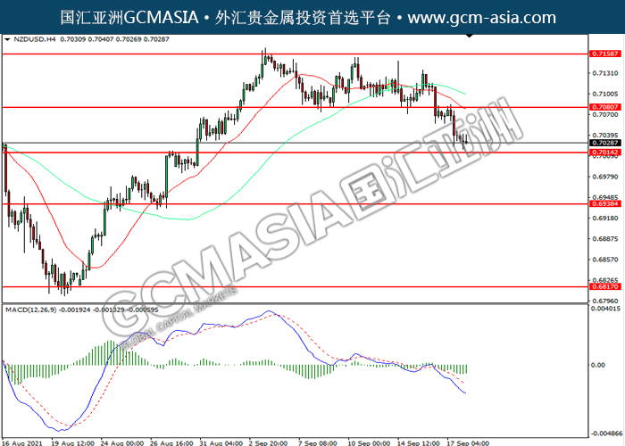 20210920 NZDUSD by willy | Sep 20, 2021 | 纽元兑美元 | 0 comments NZDUSD,H4: 纽美下破前期支撑,震荡下行。MACD空头动能略增,短期可关注空头为主。上方关注0.7080和0.7160压力,下方关注0.7015支撑和0.6940支撑。