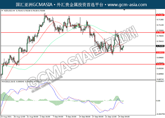 20210927 NZDUSD by willy | Sep 27, 2021 | 纽元兑美元 | 0 comments NZDUSD,H4: 纽美震荡下行,目前测试前期支撑。MACD空头动能略增,若下破可关注空头为主。上方关注0.7080和0.7160压力,下方关注0.6990支撑和0.6940支撑。