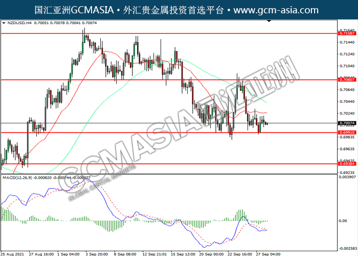 20210928 NZDUSD by willy | Sep 28, 2021 | 纽元兑美元 | 0 comments NZDUSD,H4: 纽美震荡下行,目前测试前期支撑。然而,MACD空头动能略减,短期可关注技术性回调为主。上方关注0.7080和0.7160压力,下方关注0.6990支撑和0.6940支撑。