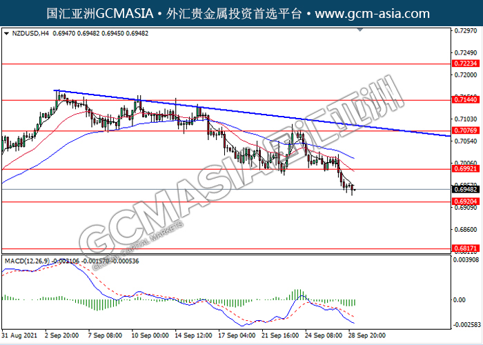 20210929 NZDUSD-午间 by keyk | Sep 29, 2021 | 纽元兑美元 | 0 comments NZDUSD,H4: 纽美空头排列,目前测试靠近前期支撑。然而,MACD空头动能略减,短期继续关注技术性多头反弹为主。上方关注0.6990压力和0.7075压力,下方关注0.6920支撑和0.6815支撑。