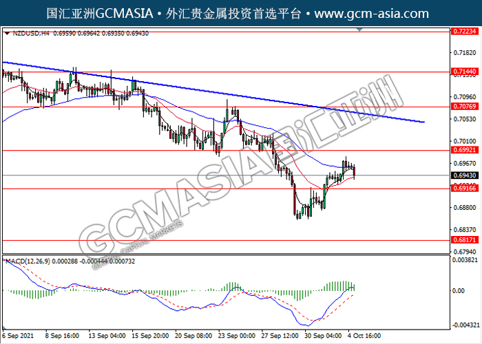 20211005 NZDUSD-午间 by keyk | Oct 5, 2021 | 纽元兑美元 | 0 comments NZDUSD,H4: 纽美高位承压回落,目前测试靠近前期支撑。MACD多头动能略减,若突破可继续看空方向为主。上方关注0.6990压力和0.7075压力,下方关注0.6915支撑和0.6815支撑。