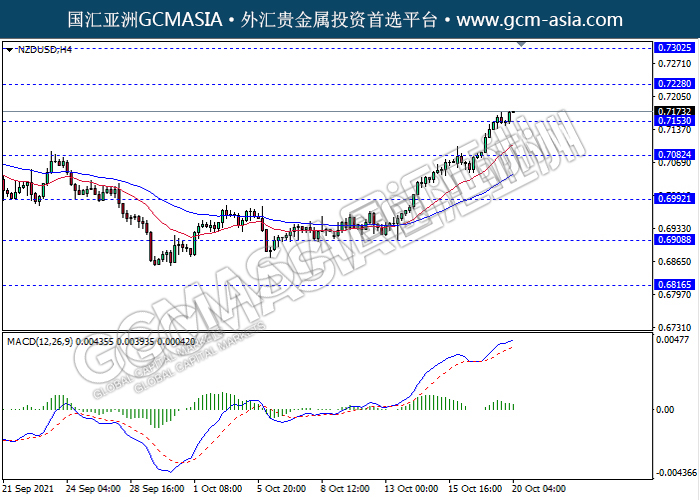 20211020 NZDUSD-午间 by keyk | Oct 20, 2021 | 纽元兑美元 | 0 comments NZDUSD,H4: 纽美突破前期压力。多头排列。然而,MACD多头动能略减,短期关注技术性空头回调为主。上方关注0.7230和0.7300压力,下方关注0.7155支撑和0.7080支撑。
