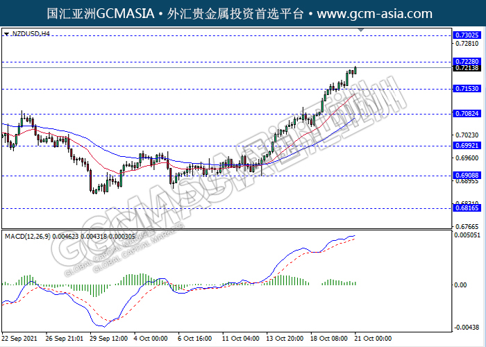 20211021 NZDUSD-午间 by keyk | Oct 21, 2021 | 纽元兑美元 | 0 comments NZDUSD,H4: 纽美多头排列,目前测试前期压力。MACD动能持续略增,若突破继续看多为主。上方关注0.7230和0.7300压力,下方关注0.7155支撑和0.7080支撑。