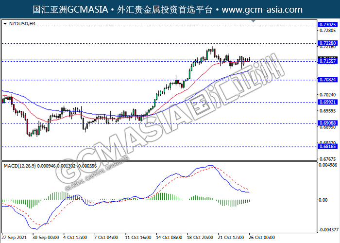 20211026 NZDUSD-午间 by willy | Oct 26, 2021 | 纽元兑美元 | 0 comments NZDUSD,H4: 纽美震荡盘整,目前测试前期支撑。然而,MACD空头动能略减,短期关注多头方向为主。上方关注0.7230和0.7300压力,下方关注0.7155支撑和0.7080支撑。