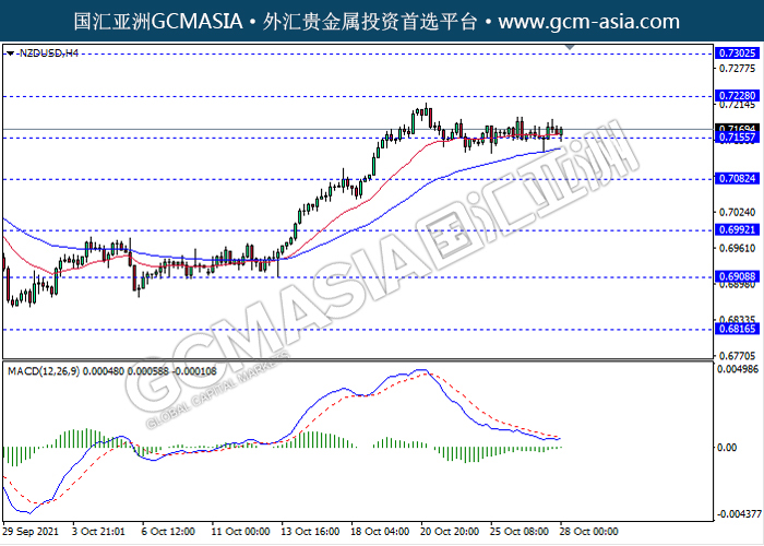 20211028 NZDUSD-午间 by willy | Oct 28, 2021 | 纽元兑美元 | 0 comments NZDUSD,H4: 纽美震荡盘整,目前测试前期支撑。然而,MACD空头动能略减,短期关注多头方向为主。上方关注0.7230和0.7300压力,下方关注0.7155支撑和0.7080支撑。