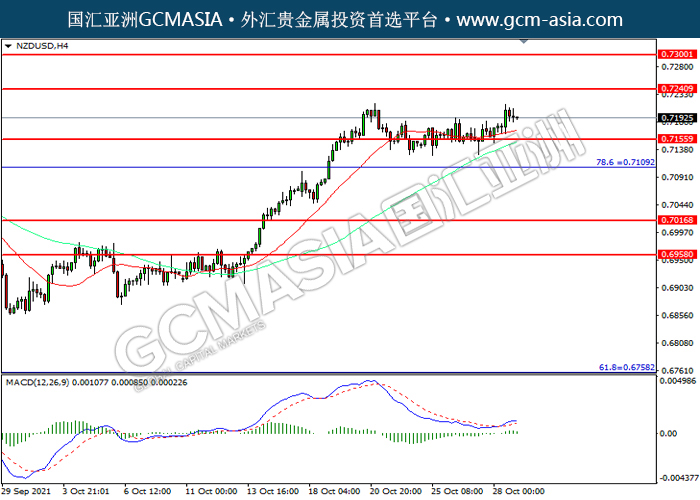 20211029 NZDUSD by willy | Oct 29, 2021 | 纽元兑美元 | 0 comments NZDUSD,H4: 纽美震荡上行。然而,MACD多头动能略减,短期可关注技术性回调为主。上方关注0.7240和0.7300压力,下方关注0.7155支撑和0.7110支撑。