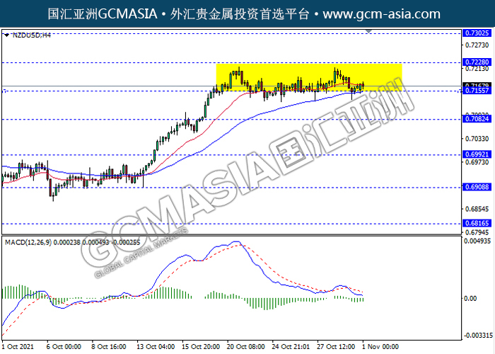 20211101 NZDUSD-午间 by willy | Nov 1, 2021 | 纽元兑美元 | 0 comments NZDUSD,H4: 纽美震荡盘整,目前测试前期支撑。然而,MACD动能略减,若突破继续看空为主。上方关注0.7230和0.7300压力,下方关注0.7155支撑和0.7080支撑。