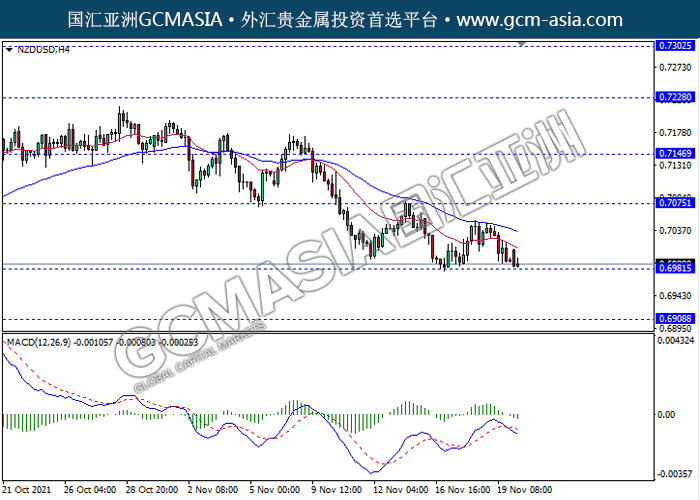 20211122 NZDUSD-午间 by willy | Nov 22, 2021 | 纽元兑美元 | 0 comments NZDUSD,H4: 纽美震荡下行,目前测试前期支撑。MACD形成死叉,动能略减,若突破可继续看空为主。上方关注0.7075压力和0.7145压力,下方关注0.6980支撑和0.6910支撑。