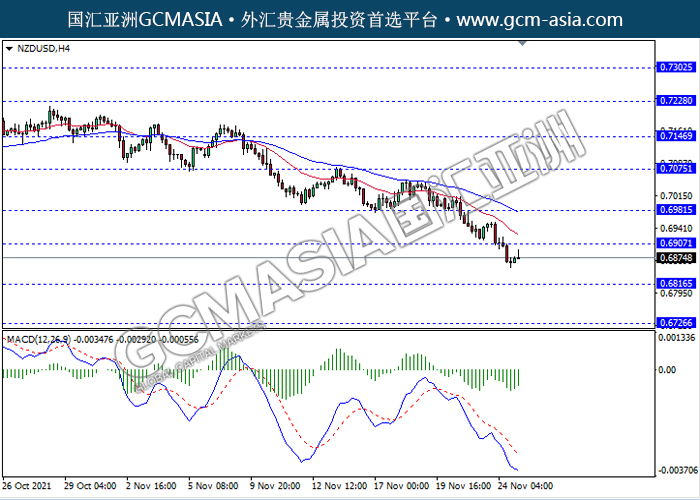 NZDUSD,H4: 纽美突破前期支撑,空头排列。然而,MACD空头动能开始略减,短期关注技术性多头反弹为主。上方关注0.6905压力和0.6980压力,下方关注0.6815支撑和0.6725支撑。