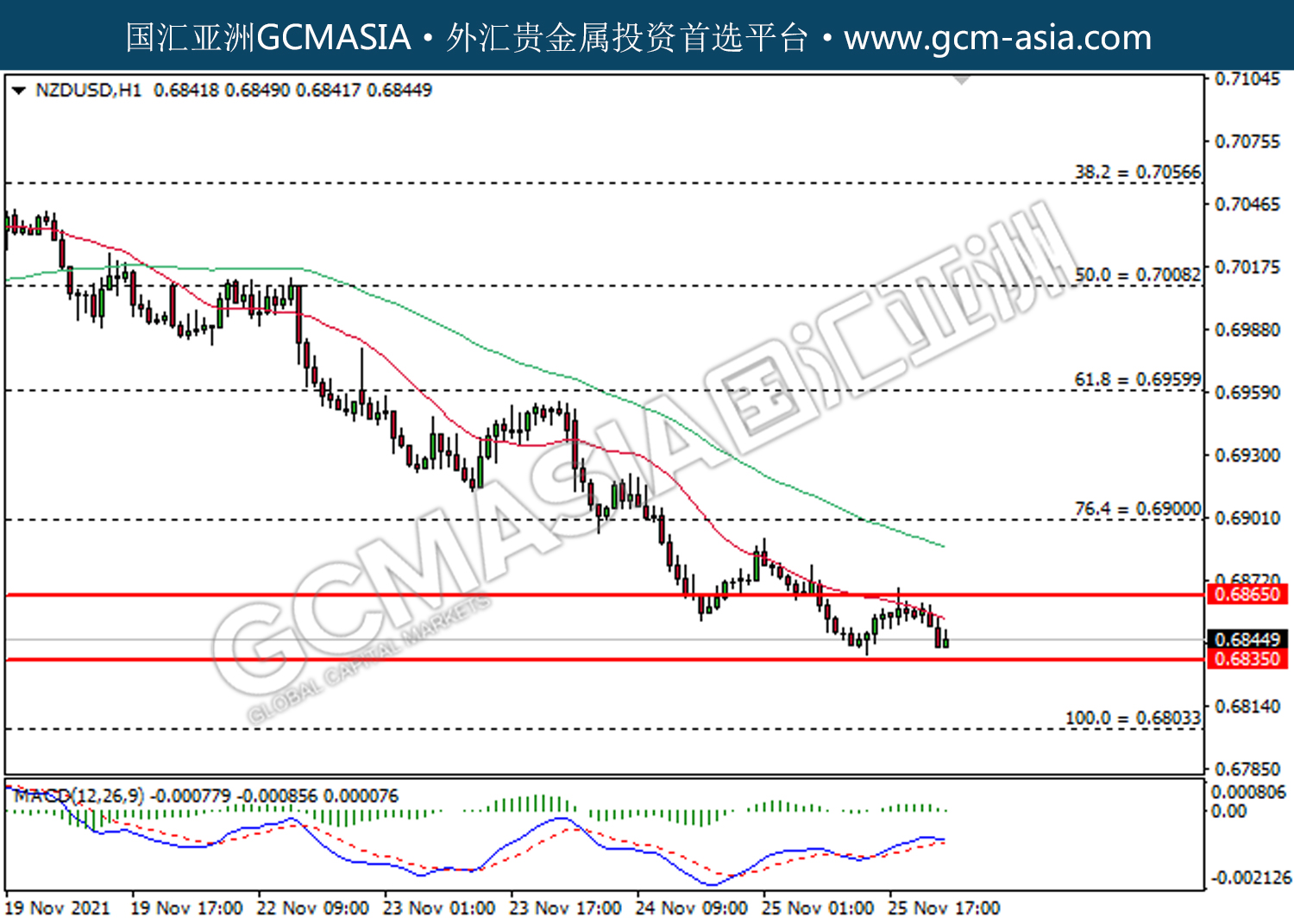 NZDUSD,H1:纽美震荡下行。MACD多头动能有所略减,短期关注空头为主。上方关注0.6865压力和0.6900压力,下方关注0.6835支撑和0.6805支撑。