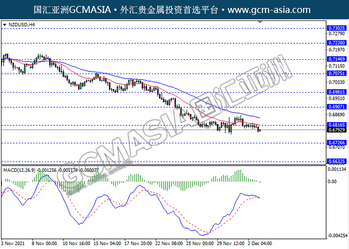 20211203 NZDUSD-午间 by skylow | Dec 3, 2021 | 纽元兑美元 | 0 comments NZDUSD,H4: 纽美震荡盘整靠近前期压力。然而,MACD形成死叉,动能略减,短期看空为主。上方关注0.6815压力和0.6905压力,下方关注0.6725支撑和0.6630支撑。