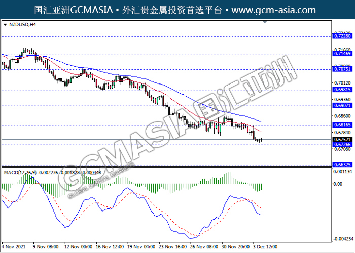20211206 NZDUSD-午间 by keyk | Dec 6, 2021 | 纽元兑美元 | 0 comments NZDUSD,H4: 纽美震荡下行,目前测试靠近前期支撑。然而,MACD空头动能有所略减,短期关注技术性多投反弹为主。上方关注0.6815压力和0.6905压力,下方关注0.6725支撑和0.6630支撑。