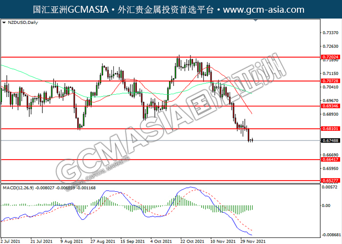 20211207 NZDUSD by willy | Dec 7, 2021 | 纽元兑美元 | 0 comments NZDUSD,Daily: 纽美下破前期支撑,震荡下行。然而,MACD空头动能略减,短期可关注技术性回调为主。上方关注0.6810和0.6935压力,下方关注0.6640支撑和0.6530支撑。