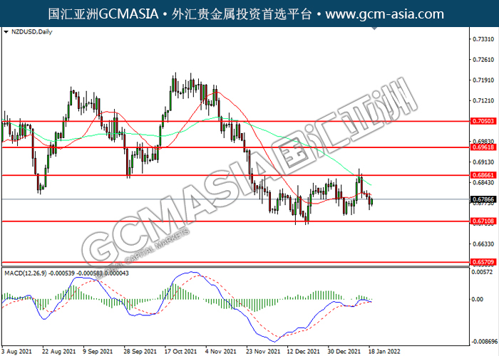 20220119 NZDUSD-午间 by willy | Jan 19, 2022 | 纽元兑美元 | 0 comments NZDUSD,Daily: 纽美高位回落。MACD多头动能略减,短期可关注空头为主。上方关注0.6865和0.6960压力,下方关注0.6710支撑和0.6570支撑。