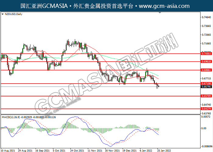 20220126 NZDUSD-午间 by willy | Jan 26, 2022 | 纽元兑美元 | 0 comments NZDUSD,Daily: 纽美下破前期支撑,持续下行。MACD空头动能略增,短期可关注空头为主。上方关注0.6710和0.6865压力,下方关注0.6570支撑和0.6425支撑。