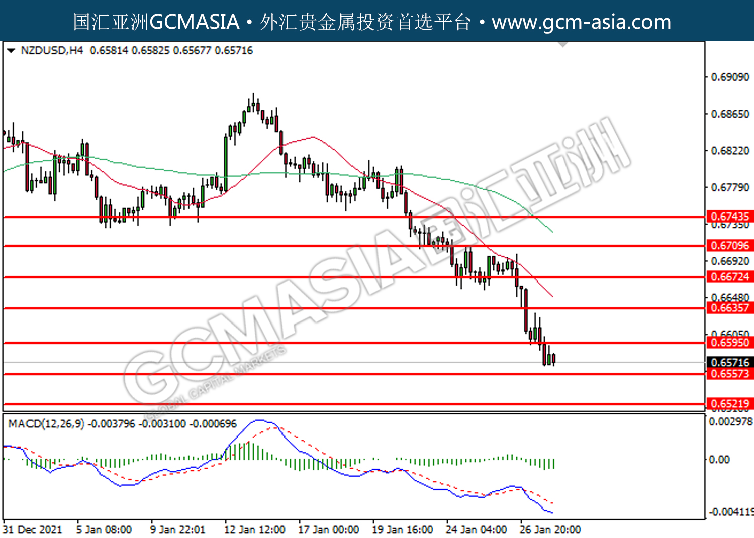 20220128 NZDUSD by willy | Jan 28, 2022 | 纽元兑美元 | 0 comments NZDUSD,H4:纽美震荡下行。MACD已形成死叉,动能转弱,短期关注空头势力为主。上方关注0.6595压力和0.6635压力,下方关注0.6560支撑和0.6520支撑。