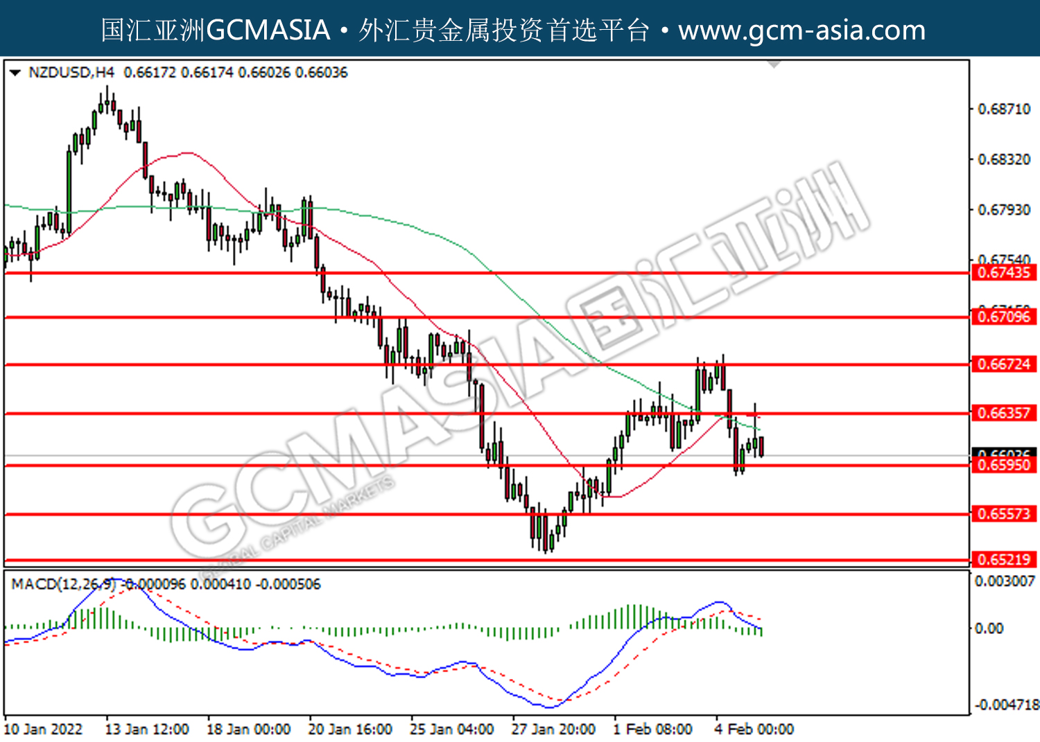 NZDUSD,H4:纽美震荡下行。MACD已形成死叉,动能偏弱,若下破可继续看空。上方关注0.6635压力和0.6670压力,下方关注0.6595支撑和0.6560支撑。
