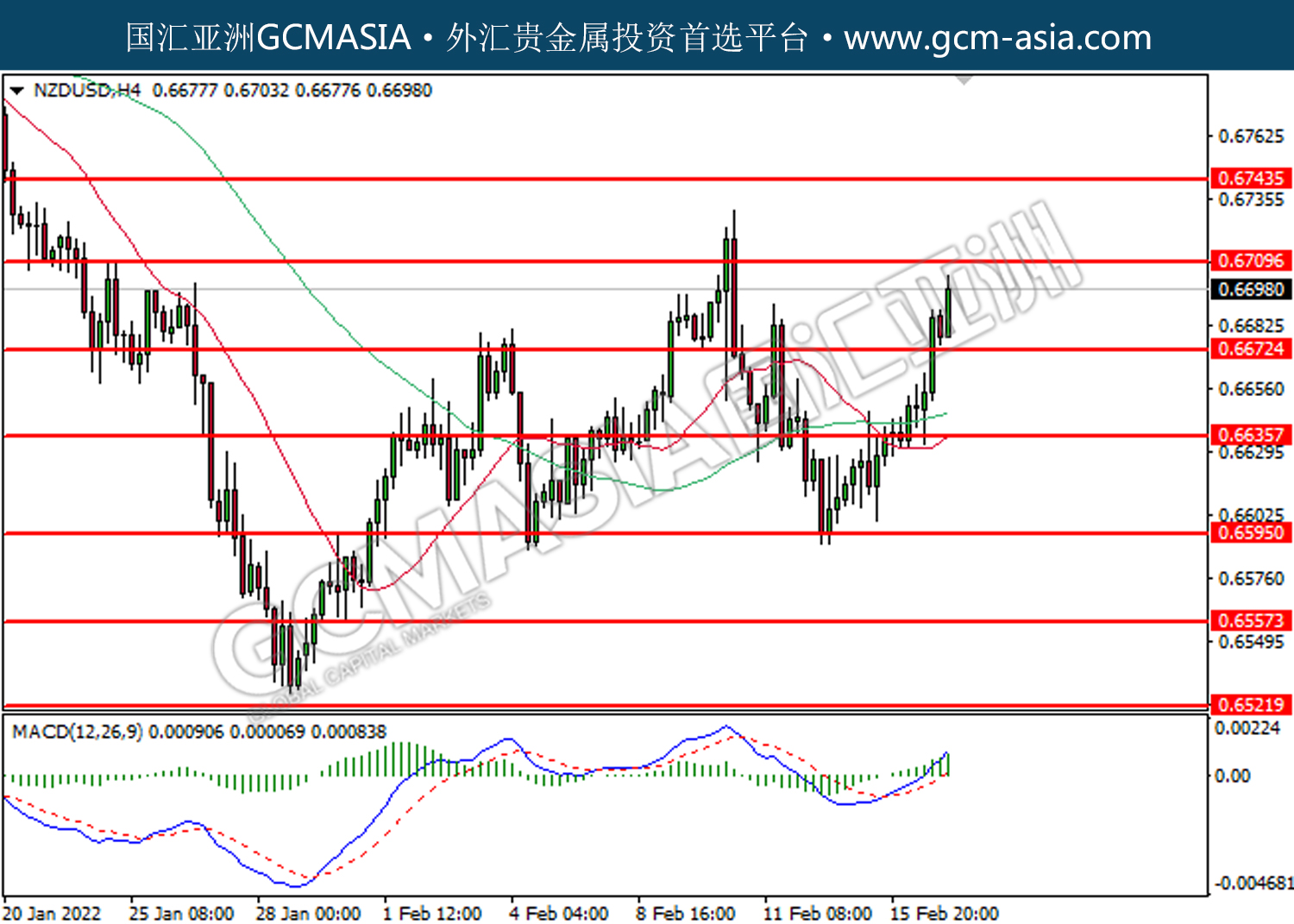 NZDUSD,H4:纽美低位反弹。MACD已形成金叉,动能偏强,短期关注多头势力。上方关注0.6710压力和0.6745压力,下方关注0.6670支撑和0.6635支撑。