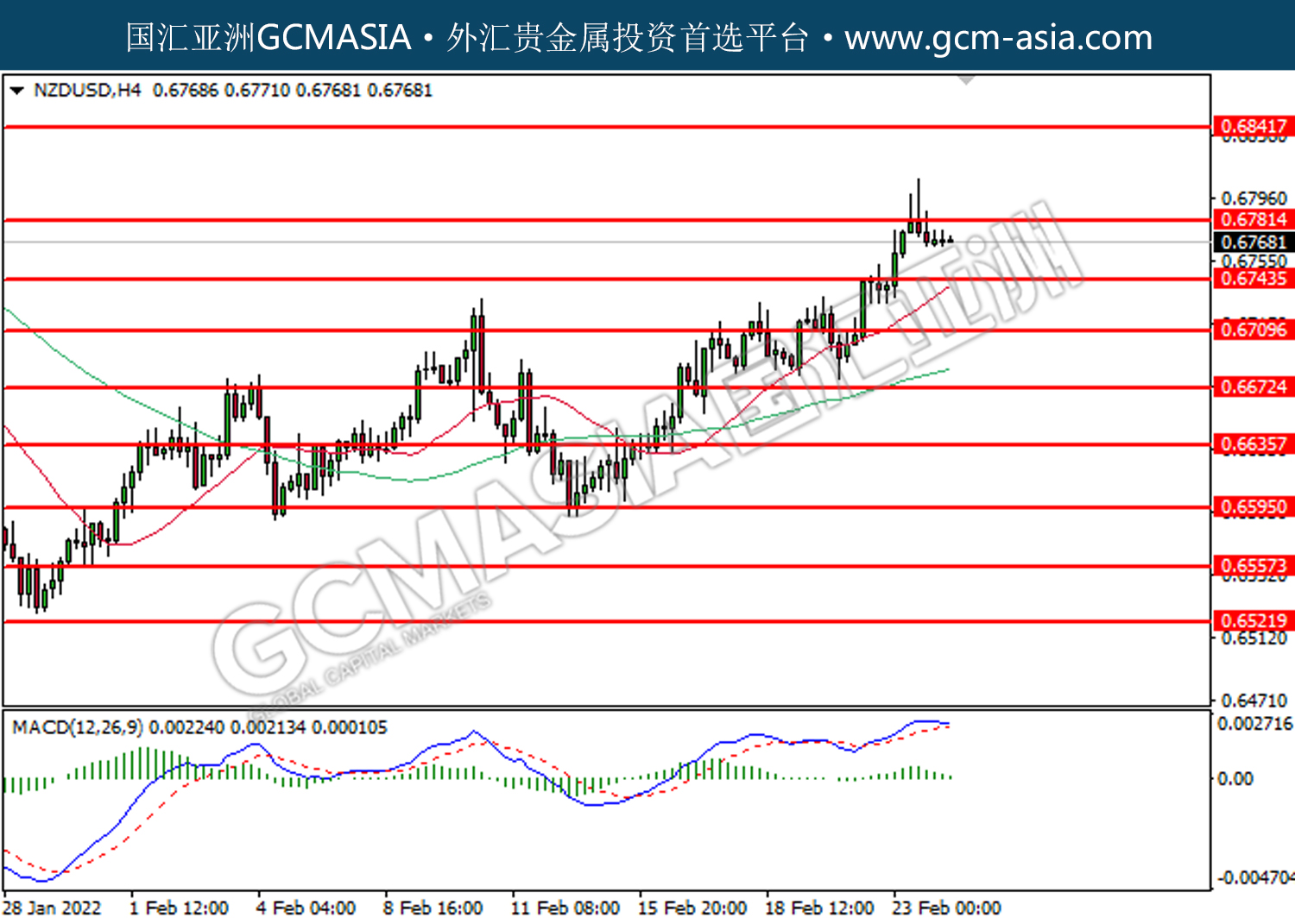 NZDUSD,H4:纽美受承压回落。MACD多头动能有所略减,短期关注空头为主。上方关注0.6780压力和0.6840压力,下方关注0.6745支撑和0.6710支撑。