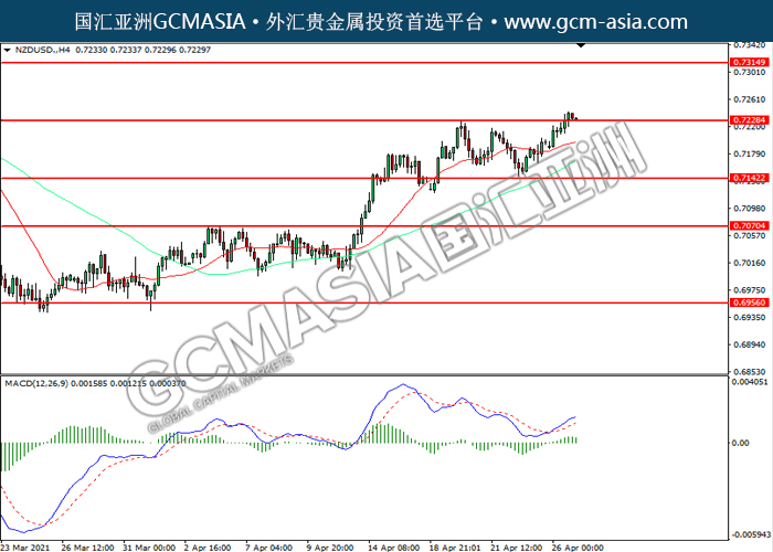 NZDUSD,H4: 纽美震荡上行,目前测试前期压力。然而,MACD多头动能略减,短期可关注技术性回调为主。上方关注0.7230和0.7315压力,下方关注0.7140支撑和0.7070支撑。