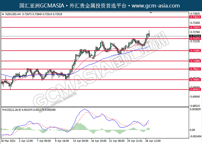 290421 NZDUSD-午间 by willy | Apr 29, 2021 | 纽元兑美元 | 0 comments GCMAsia-NZDUSD NZDUSD 2021-04-29 NZDUSD,H4: 纽美高位承压后回落。MACD显示空头信号,动能略减,短期可关注空头趋势。上方关注0.7300和0.7360压力,下方关注0.7235支撑和0.7170支撑。