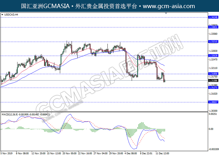 20131213 USDCAD-午间 by keyk | Dec 13, 2019 | 美元兑加元 | 0 comments GCMAsia - USDCAD USDCAD 2019-12-13 USDCAD, H4: 美加高位承压回落。MACD动能略减,中期继续看空为主。上方关注1.3185压力和1.3260压力,下方关注1.3125支撑和1.3065支撑。
