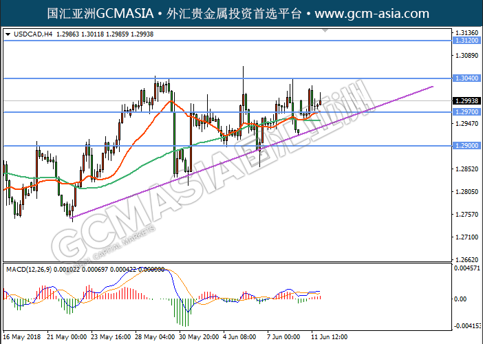 USDCAD H4:美加处于上升三角形区间震荡,关注突破;均线缠绕,MACD动能偏强,仍有上行空间,后市上行几率略大。上方关注1.3040压力和1.3120压力,下方关注1.2970支撑和均线支撑。