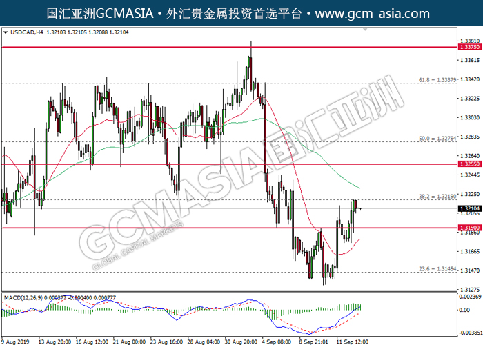 20190913 USDCAD by keyk | Sep 13, 2019 | 美元兑加元 | 0 comments GCMAsia - USDCAD USDCAD 2019-09-13 USDCAD,H4:美加受承压回落。MACD多头动能有所略减,短期关注空头势力为主。上方关注1.3220压力和1.3255压力,下方关注1.3190支撑和1.3145支撑。