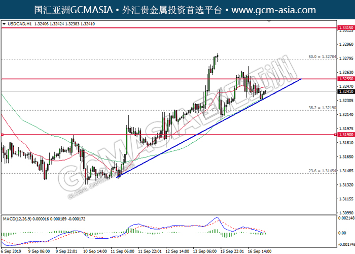 20190917 USDCAD by willy | Sep 17, 2019 | 美元兑加元 | 0 comments GCMAsia - USDCAD USDCAD 2019-09-17 USDCAD,H1:美加低位反弹。MACD空头动能有所略减,短期关注多头势力为主。上方关注1.3255压力和1.3280压力,下方关注1.3220支撑和1.3190支撑。