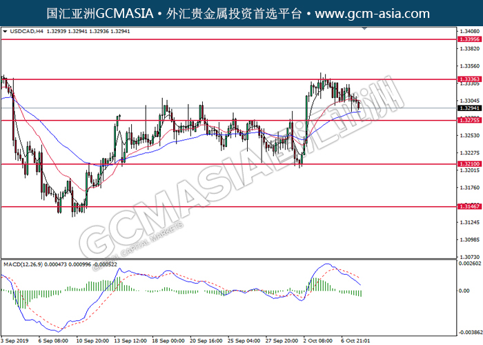 USDCAD,H4:美加高位承压回落。MACD动能持续略减,短期继续看空为主。上方关注1.3335压力和1.3395压力,下方关注1.3275支撑和1.3210支撑。