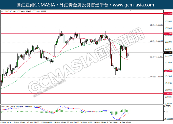 20191210 USDCAD by willy | Dec 9, 2019 | 美元兑加元 | 0 comments GCMAsia - USDCAD USDCAD 2019-12-10 USDCAD,H4:美加低位反弹。MACD多头动能有所略增,短期关注多头势力。上方关注1.3280压力和1.3310压力,下方关注1.3220支撑和1.3170支撑。