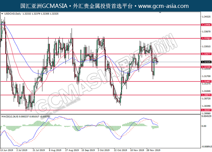 USDCAD, Daily: 美加高位承压回落。然而,MACD空头动能略减,短期可关注技术性反弹。上方关注1.3265压力和1.3335压力,下方关注1.3210支撑和1.3145支撑。