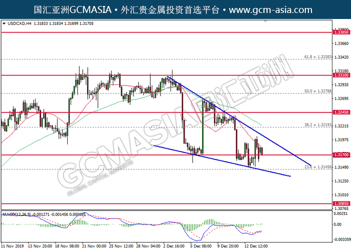 USDCAD,H4:美加震荡下行,目前测试前期支撑。MACD多头动能有所略减,若下破可继续看空。上方关注1.3220压力和1.3245压力,下方关注1.3170支撑和1.3145支撑。