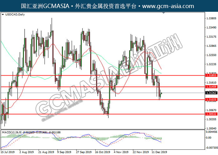 20191220 USDCAD by keyk | Dec 20, 2019 | 美元兑加元 | 0 comments GCMAsia - USDCAD USDCAD 2019-12-20 USDCAD, Daily: 美加低位反弹。MACD空头动能略减,短期可关注多头走势为主。上方关注1.3145压力和1.3185压力,下方关注1.3100支撑和1.3055支撑。