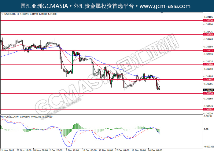 20191227 USDCAD-午间 by skylow | Dec 27, 2019 | 美元兑加元 | 0 comments GCMAsia - USDCAD USDCAD 2019-12-27 USDCAD, H4: 美加突破后持续下行。MACD空头动能略增,短期可关注空头走势为主。上方关注1.3145压力和1.3210压力,下方关注1.3085支撑和1.3020支撑。