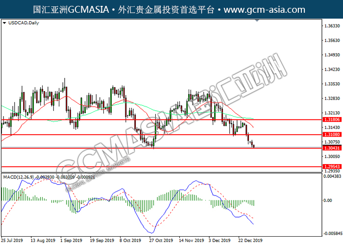 USDCAD, Daily: 美加空头排列,目前测试前期支撑。MACD空头动能略增,若下破可关注空头为主。上方关注1.3110压力和1.3180压力,下方关注1.3045支撑和1.2955支撑。