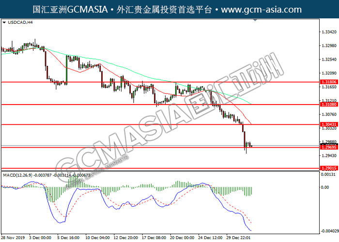 USDCAD, H4: 美加空头排列,目前测试前期支撑。然而,MACD空头动能略减,短期关注技术性回调。上方关注1.3045压力和1.3110压力,下方关注1.2970支撑和1.2900支撑。