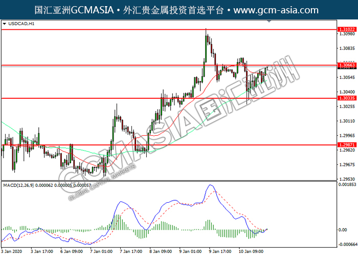 USDCAD, H1: 美加震荡上行,目前测试前期压力。MACD空头动能略减,若突破可关注多头为主。上方关注1.3065压力和1.3100压力,下方关注1.3035支撑和1.2985支撑。