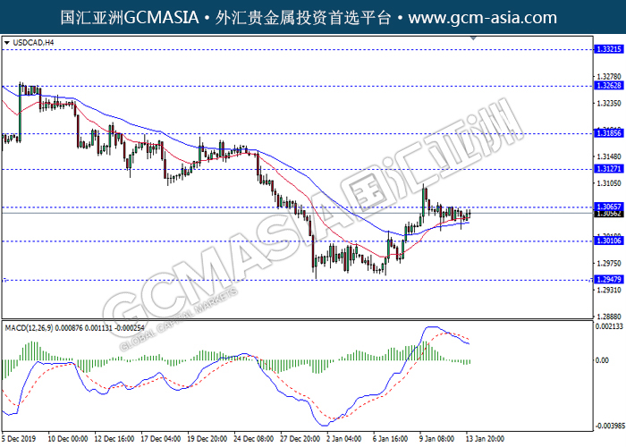 USDCAD, H4: 美加震荡盘整,目前测试靠近前期压力。然而,MACD空头动能有所略减,若突破关注多头走势为主。上方关注1.3065压力和1.3125压力,下方关注1.3010支撑和1.2945支撑。