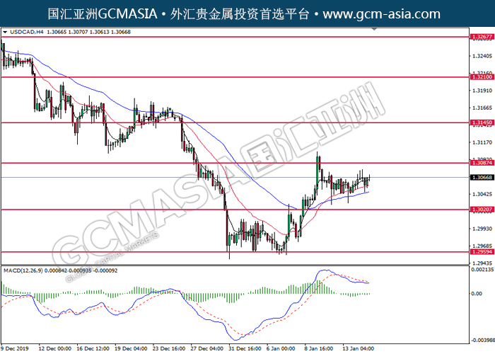 USDCAD, H4: 美加触及50均线(蓝色)后反弹。MACD空头动能略减,短期可关注多头为主。上方关注1.3085压力和1.3145压力,下方关注1.3020支撑和1.2960支撑。