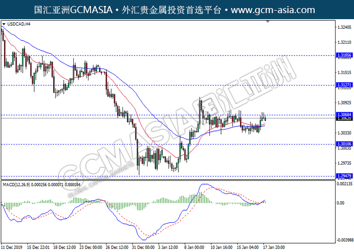 USDCAD,H4:美加震荡盘整,测试靠近前期压力。MACD形成金叉,动能略增,若突破关注多头趋势为主。上方关注1.3070压力和1.3125压力,下方关注1.3010支撑和1.2945支撑。