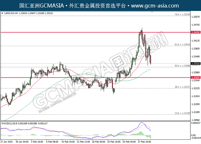 20200303 USDCAD by willy | Mar 2, 2020 | 美元兑加元 | 0 comments GCMAsia - USDCAD USDCAD 2020-03-03 USDCAD,H4:美加震荡下行。MACD已形成死叉,动能略减,短期关注空头为主。上方关注1.3290压力和1.3445压力,下方关注1.3305支撑和1.3265支撑。